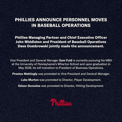 Fuld will eventually replace Dave Buck, a longtime Phillies business executive who is retiring at the end of December. The Phillies have not said who will run the business side in the interim until Fuld finishes his degree. Middleton will assume some of those responsibilities.